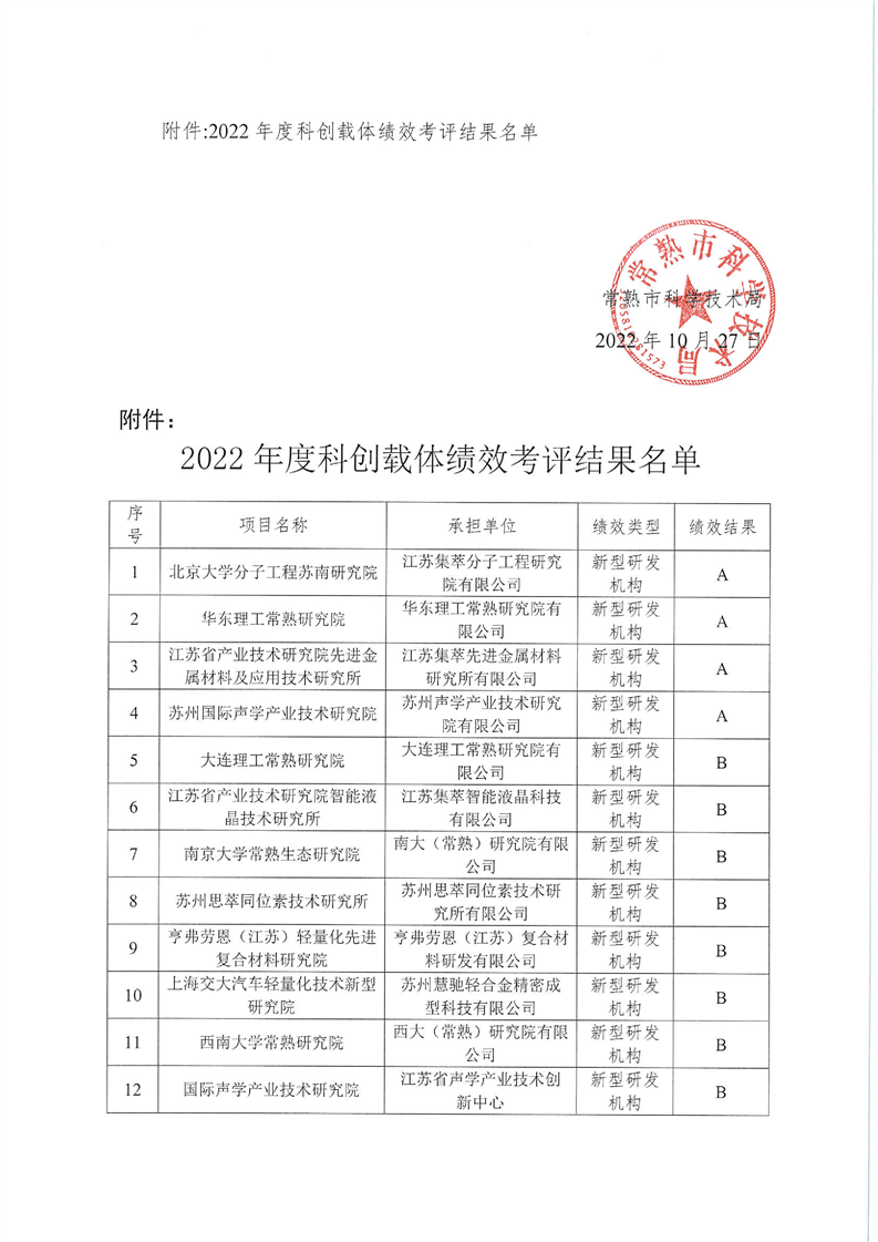 2022年度常熟市科创载体绩效评估项目结果公示