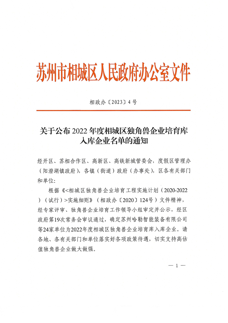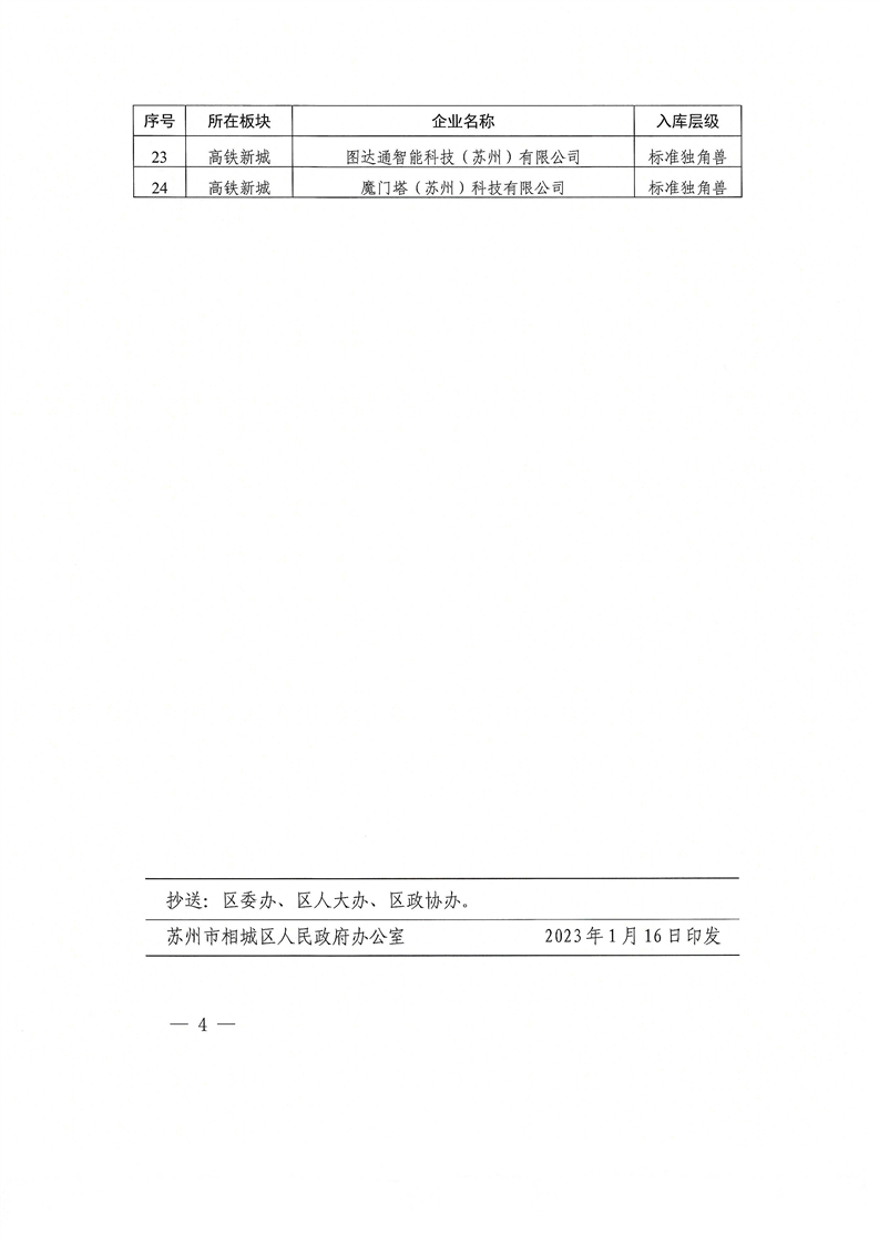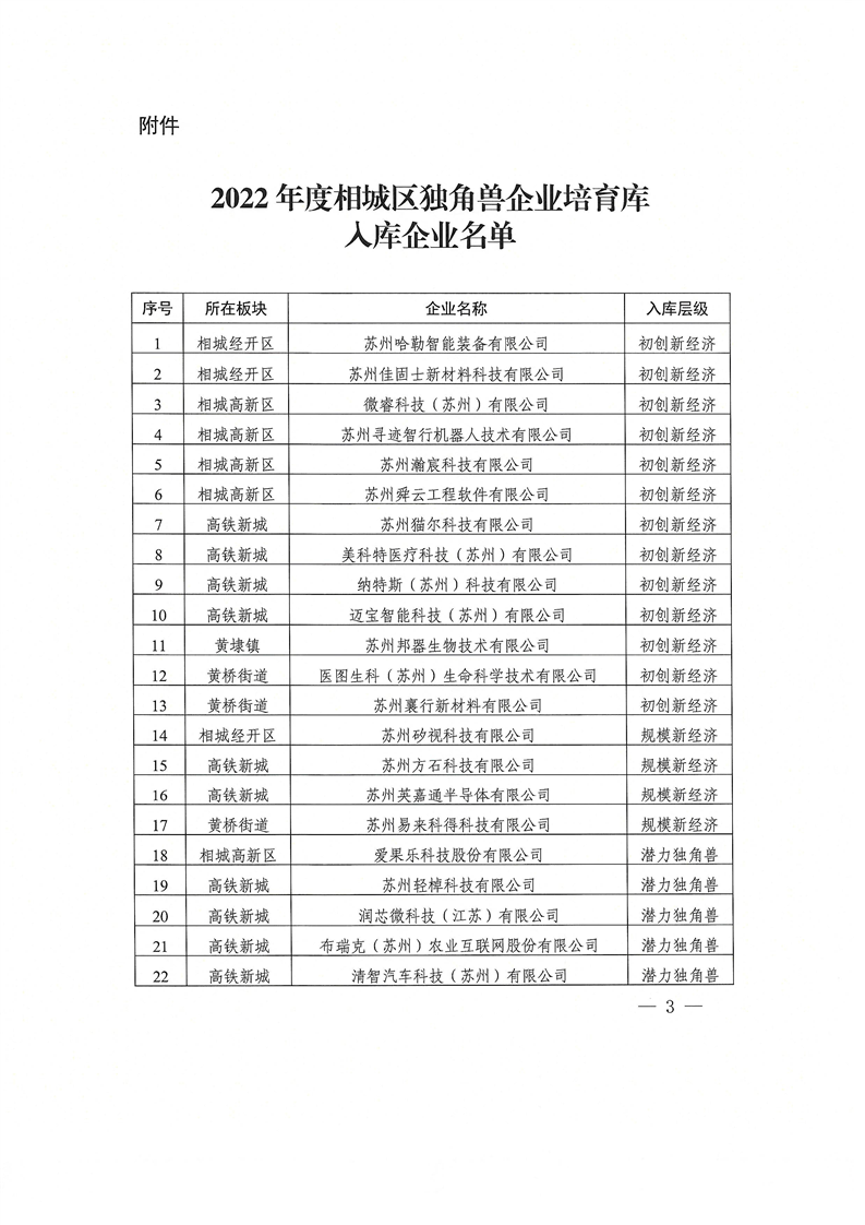 关于公布2022年度相城区独角兽企业培育库入库企业名单的通知